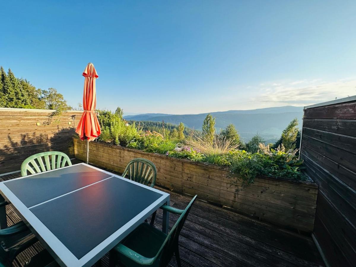 テラスは山の穏やかな景色を提供します。
