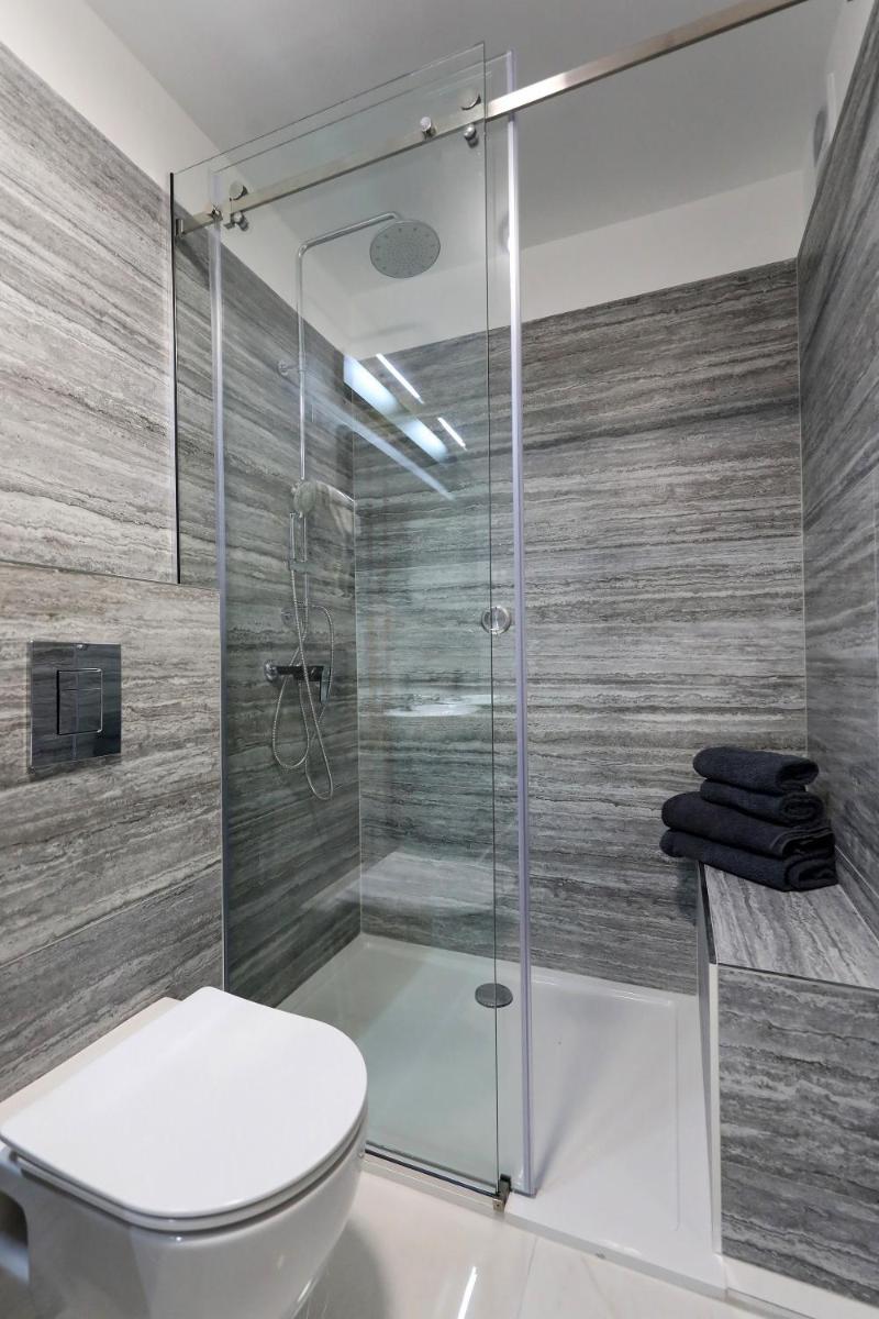 快適なベッドと大きなモダンなバスルーム。