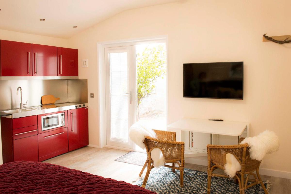 内側の中庭の景色を望むテラスを提供するこのアパートには、フラットスクリーンテレビ、食器洗い機のある設備の整った簡易キッチン、電子レンジ、トースター、ウォークインシャワー付きのバスルームもあります。