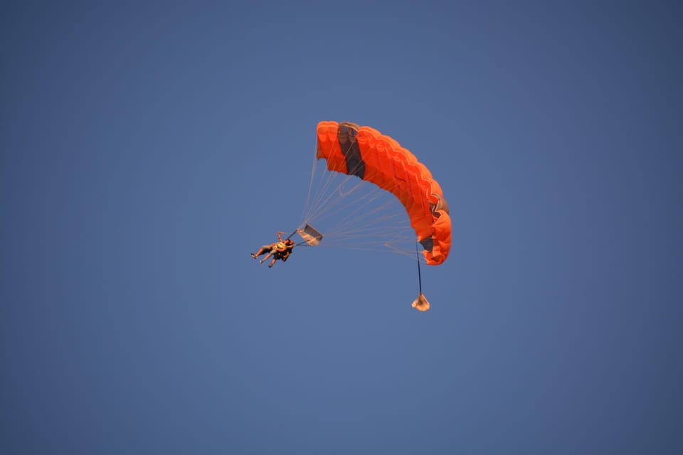 含まれています | 時速200キロメートルの初期速度で最大45秒の自由落下を提供するタンデムスカイダイビングエクスペリエンス。これには、指定されたジャンプ高さに到達するための約20分間のスリリングな空中ツアーが含まれます。参加者は、安全に着陸する前に、自分のパラシュートの下で約4分間滑ります。認定されたタンデムインストラクターによる安全ブリーフィングは、空気への降下の前にあります。フルセットを含むレンタル機器が提供されます。リクエストに応じて、ジャンプ後の写真やビデオを取得できます。90キログラムから95キログラムの体重の個人に適用される追加の50ユーロの料金があります。 |